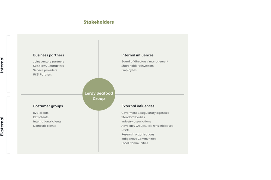 A stakeholder is an accountant, group, organisation, member or system who affects or can be affected by an organisation's actions. Lerøy Seafood Group has various stakeholders and communicates with these via meetings, annual reports, environmental reports, GRI reports, CDP reports, communication in the media, announcements, registrations, public reporting, joint projects, partnership agreements, the stock exchange, websites etc.
