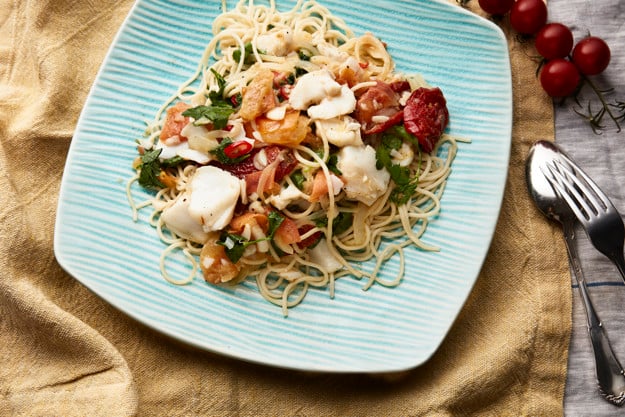 - Er barna veldig glad i spagetti, er denne retten med torsk helt prefekt. Med smaker av olivenolje og soltørkede tomater oser denne oppskriften av Italia.